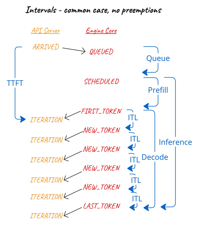 SCHEDULEDand the subsequent firstNEW_TOKENS. - Decode interval - between first (after the most recent